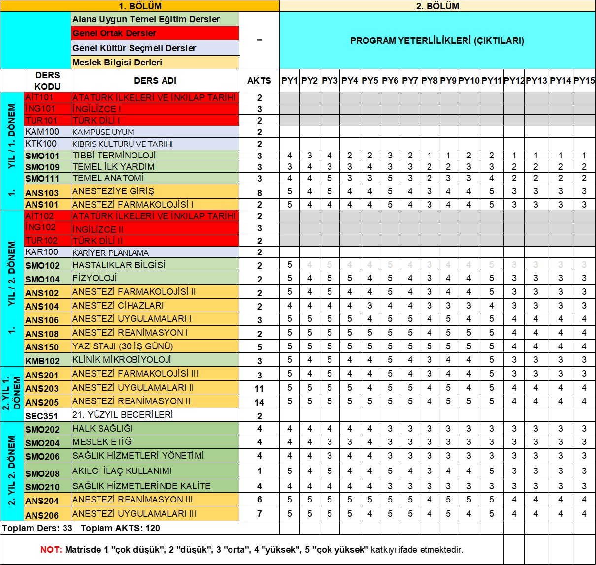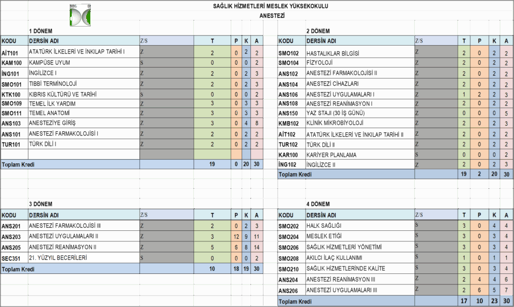 Anestezi Teknikerliği ön lisans programı toplam 120 AKTS kredilik 33 dersten oluşmaktadır.