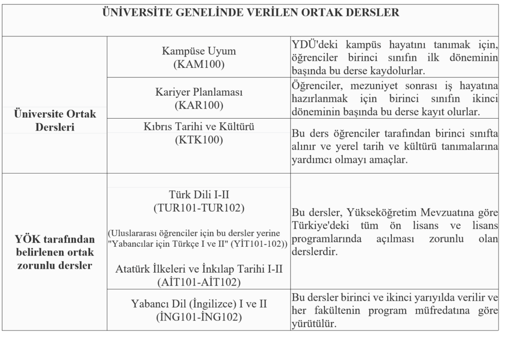 Her programda Türkiye Yükseköğretim Kurulu (YÖK) tarafından belirlenen ortak zorunlu dersler ve Üniversite Senatosu tarafından belirlenen diğer ortak dersler bulunur.
