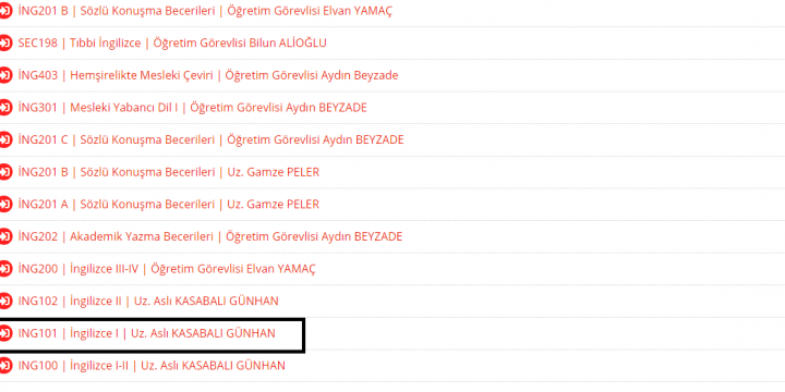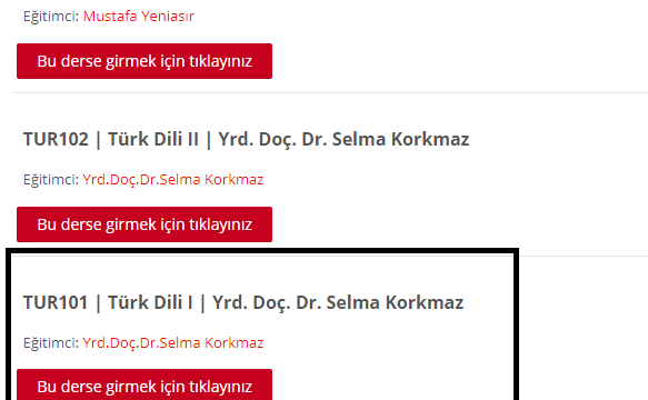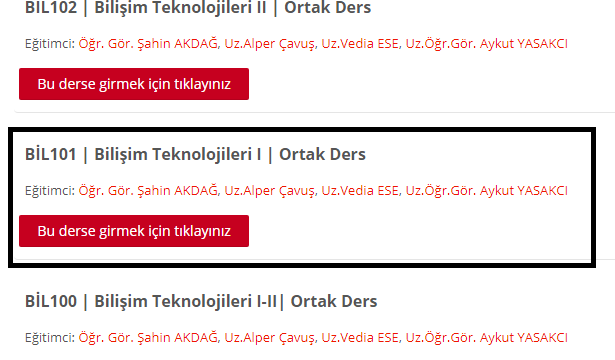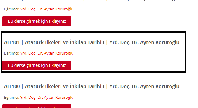 6. Her derse tek tek tıklayıp, her dersin içerisinde bulunan uygun kodlu dersi (AİT101, İNG101, TUR101, BİL101) işaretleyiniz (bu derse girmek için tıklayınız seçeneğini tıklayarak).